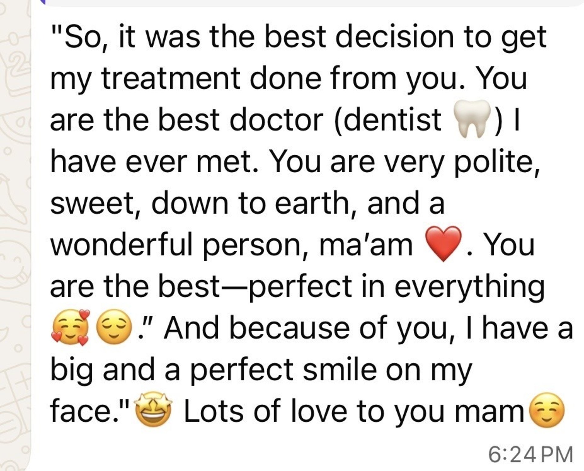 I underwent treatment with self ligating metal braces. I was nervous at first but the journey was much smoother than I expected. You always made sure that I am comfortable, and I always felt like I was in expert hands. I am absolutely in love with my smile now, it’s given me a huge boost in confidence. I especially appreciated how patient you were in explaining each stage of the process; it really put my mind at ease. Honestly, I can’t think of anything to improve, the care was top-notch from day one. Thank you for everything!