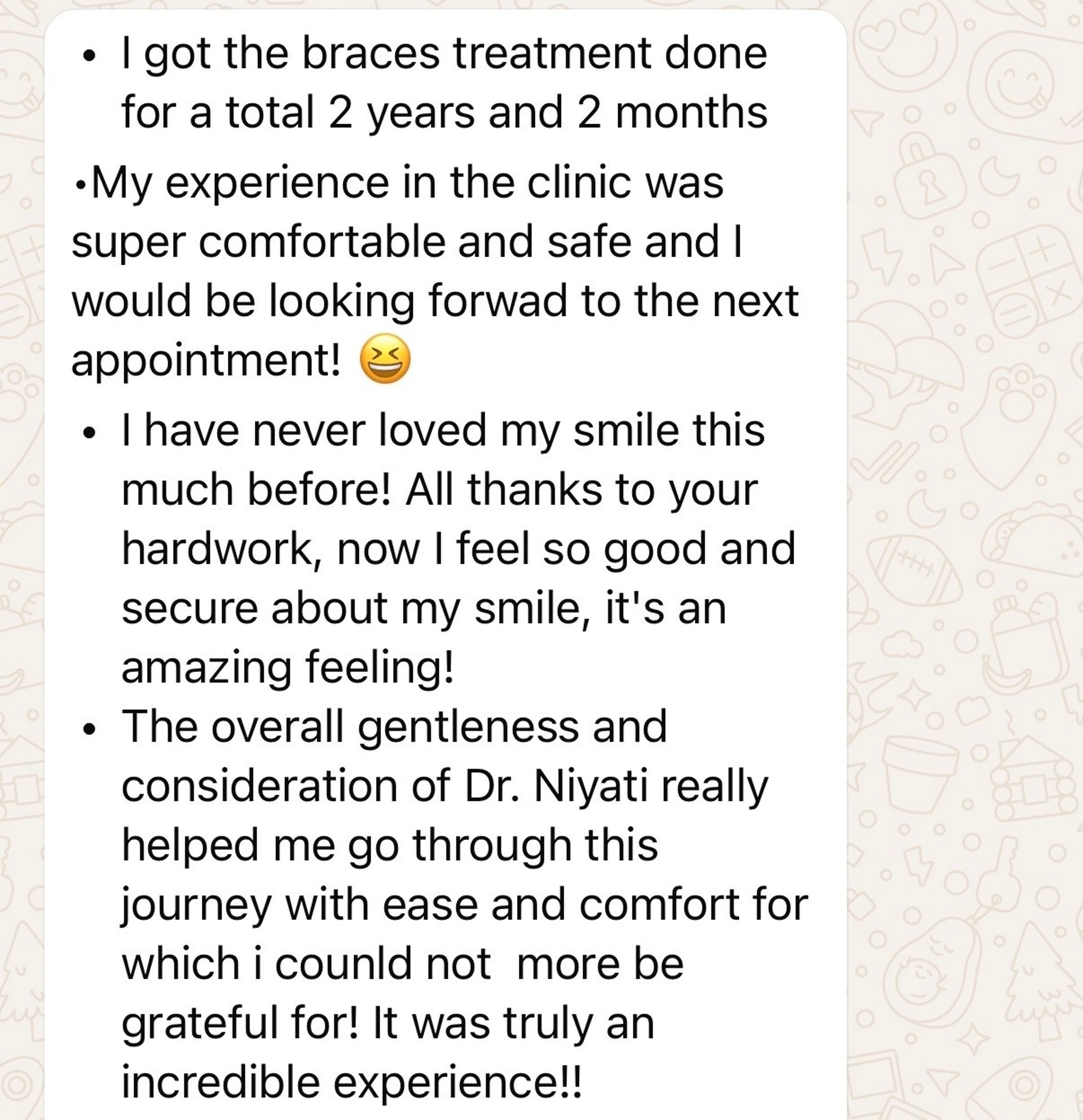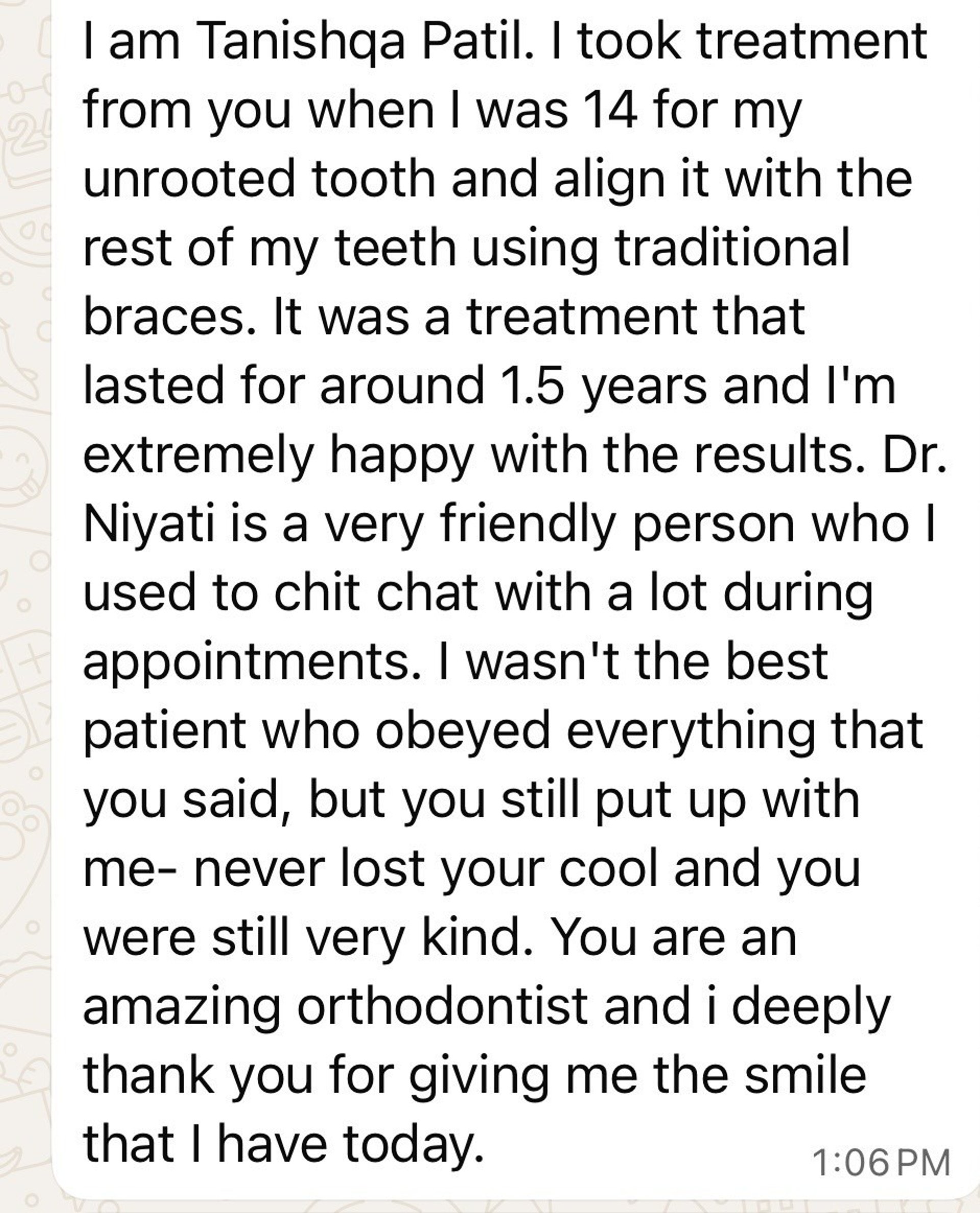 I initially started my treatment with braces and later switched to aligners as I was moving out of the city. My experience with braces was a bit tough mainly because of the food restrictions but once I moved to aligners, the process became really comfortable and easy to manage.I really appreciated the clear communication, smooth appointments, and the overall care throughout the treatment. I am loving my current smile and feel more confident about it.